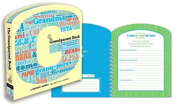 Was $140 - 1 left This unique keepsake makes it easy and fun for grandparents to share their stories with their grandchildren. The Grandparent Book is organized into sections, each devoted to a stage of life: childhood, tweenhood to adulthood, and (best of all) GRANDHOOD! With prompts for collecting grand memories and pages for grandparents and grandkids to fill out together, this journal is a great fuss-free way to bring generations together. -96 pages.