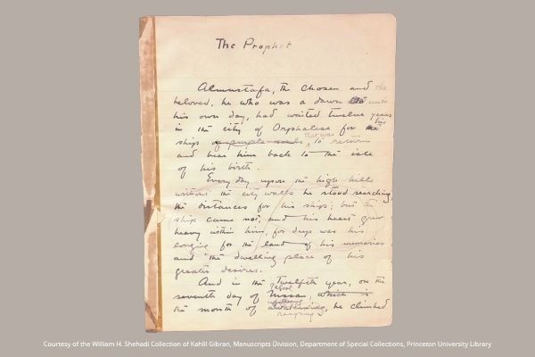 Reproduced here is an early English draft of Gibran’s The Prophet, which was published by Alfred A. Knopf in New York City in 1923. The book, also published in Arabic in Cairo at the same time, is a collection of 26 prose poetry fables. Telling the story of a prophet named Al Mustafa, the work is divided into chapters dealing with topics such as family and marriage, crime and punishment, and reason and passion. Readers and literary critics have drawn parallels to the theological topics in the work of William Blake, Walt Whitman and Ralph Waldo Emerson. Aside from these Western writers, recognized themes of influence in The Prophet include Arabic art, European classicists like Leonardo da Vinci and more modern surrealist symbolism.