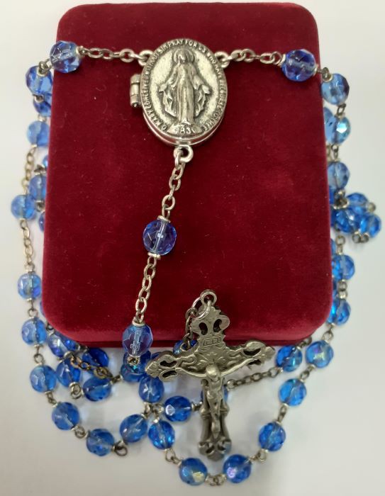 Gift Boxed- Clamshell padded box. Prayer Petition Locket Rosary with 7mm Blue Aurora Glass beads and a Pewter Crucifix and center. This Rosary has a locket center with a piece of per to write your prayer petition . Made in the USA by Mc Van Inc