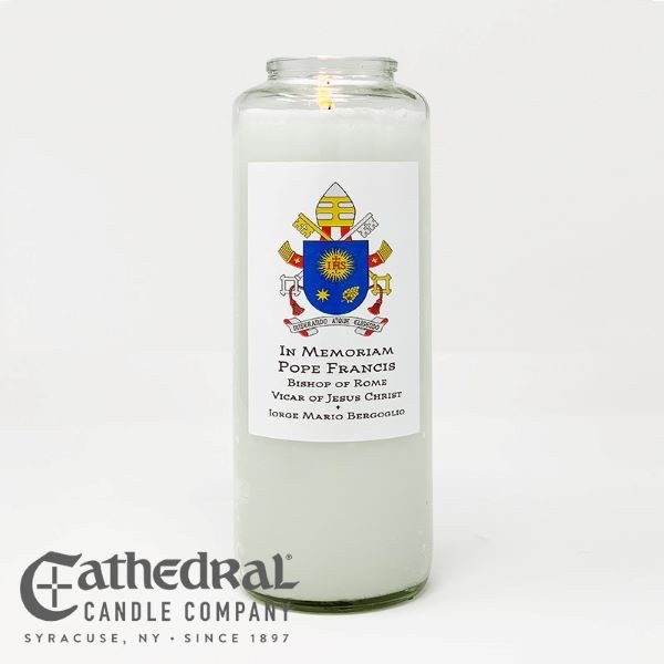 Available by Order. Please contact us. Memorial Candle in Glass bottle. In celebration of the life and Papacy of Jorge Mario Bergoglio, Pope Francis, this candle features a three-dimensional image of the Papal Coat of Arms on the bottle. This candle is appropriate for use in memorial and liturgical services