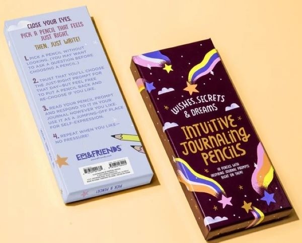 Close your eyes. Pick the pencil that feels just right. Then… just write. With these cool pencils, you'll never be at a loss for what to journal about again. Our Wishes pencil set gently guides the user to explore topics like everyday magic, creation & manifestation, taking baby steps towards big dreams, and inner strength & wisdom. Graphite pencils for journaling with prompts printed on each pencil! Ten 7.5” wooden pencils in keepsake box with attached lid