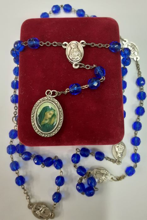 Gift Boxed. Clamshell Padded Box. 7MM Blue glass Beads with Silver Oxide Sorrow Medals (7) and Pewter Lady of Sorrows Decal. Made in the USA