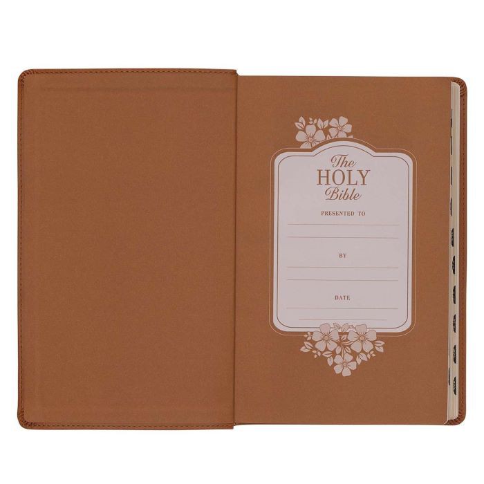 The lay-flat spine allows the Bible to open completely flat without damaging the spine—a useful feature when this Bible is placed on a desk or podium and used as a teaching Bible. The Giant, easy-to-read 14-point type allows you to read your Bible up close without eye strain or from a short distance while teaching. Essential study resources include double-column formatting, a thematic Scripture verse finder, concordance, topical verse finder, the words of Christ are printed in red ink, and a one-year Bible reading plan.