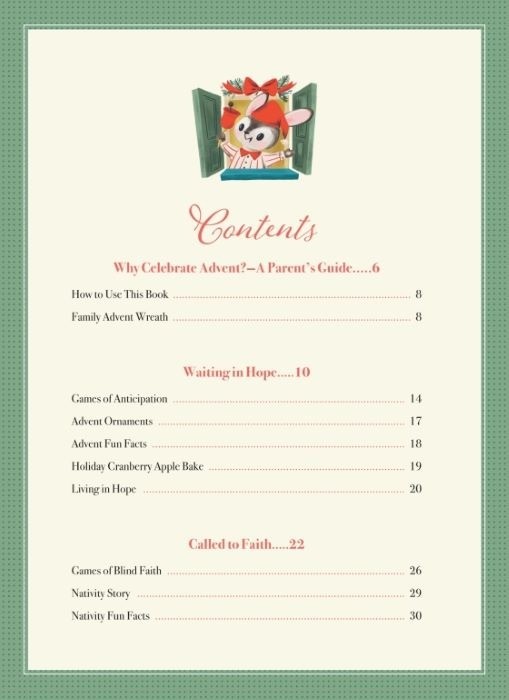 Family Activity Make this an Advent tradition year after year. Designed to follow the four weeks of Advent—Hope, Faith, Joy, and Peace Features an Advent calendar with lift-the-flap windows that can be used year after year. Contains game ideas, recipes, holiday tips, fun facts, and encouragement on how to live out the themes of Advent as an individual, with your family, and in your community. Hardcover 80 pages 8"x11"